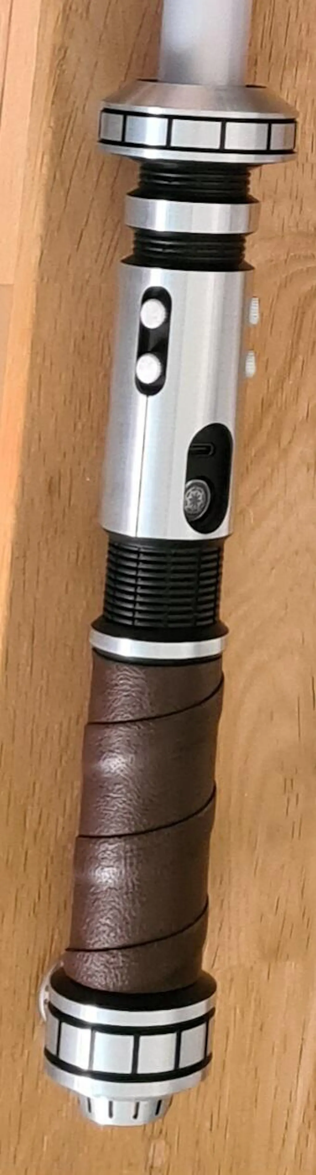 The Gladius Mk3 features a flared emitter that provides a natural choke point and protects the hands from blade strikes while dueling. The switch features a double countersink to prevent accidental deactivation and is accented by four low profile knob greeblies that improve the aesthetic complexity. The lower grip has a spiral leather wrap for comfort and a flared pommel that provides a hand stop for lunging thrusts.